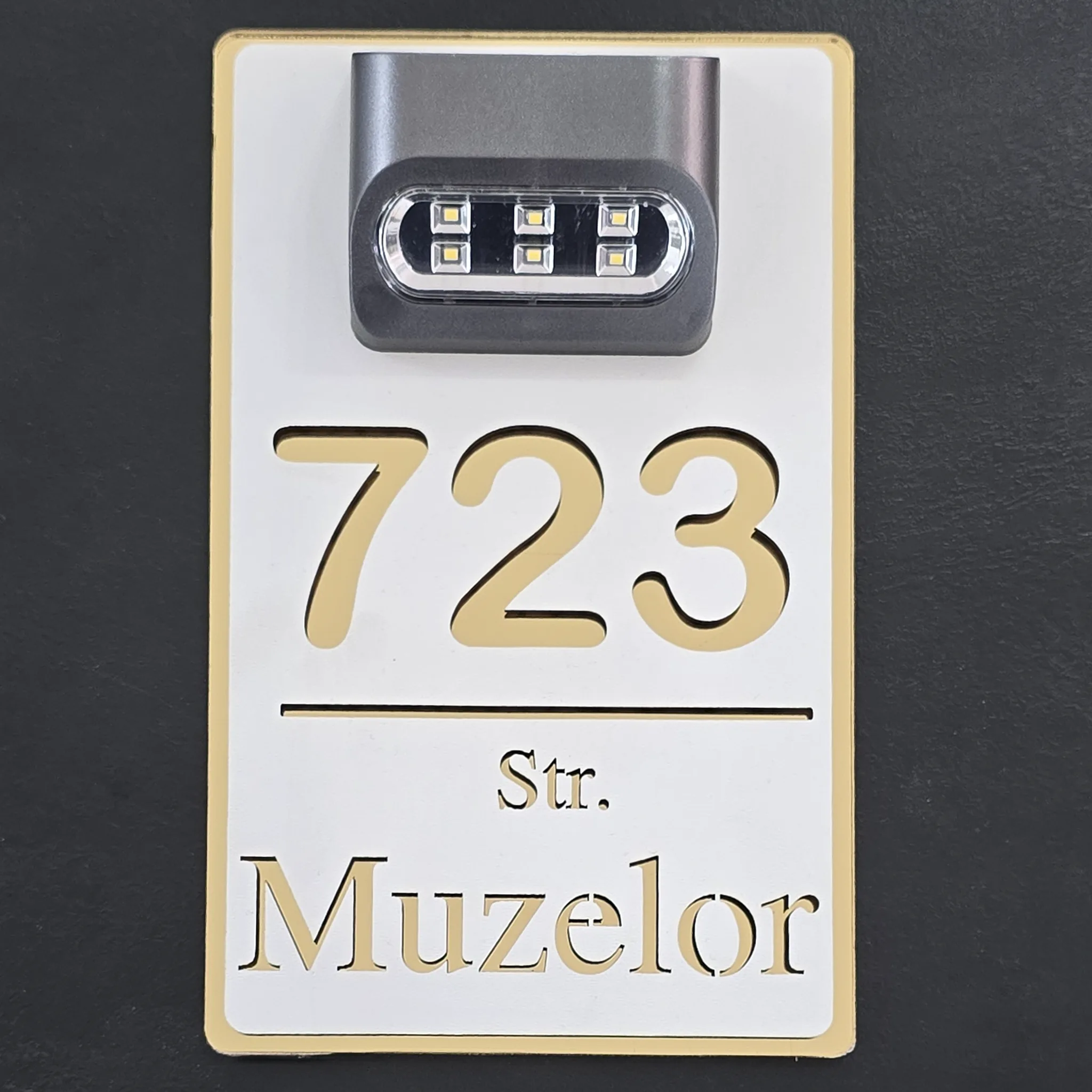 Numar casa premium cu lampa solara Auriu cu Alb